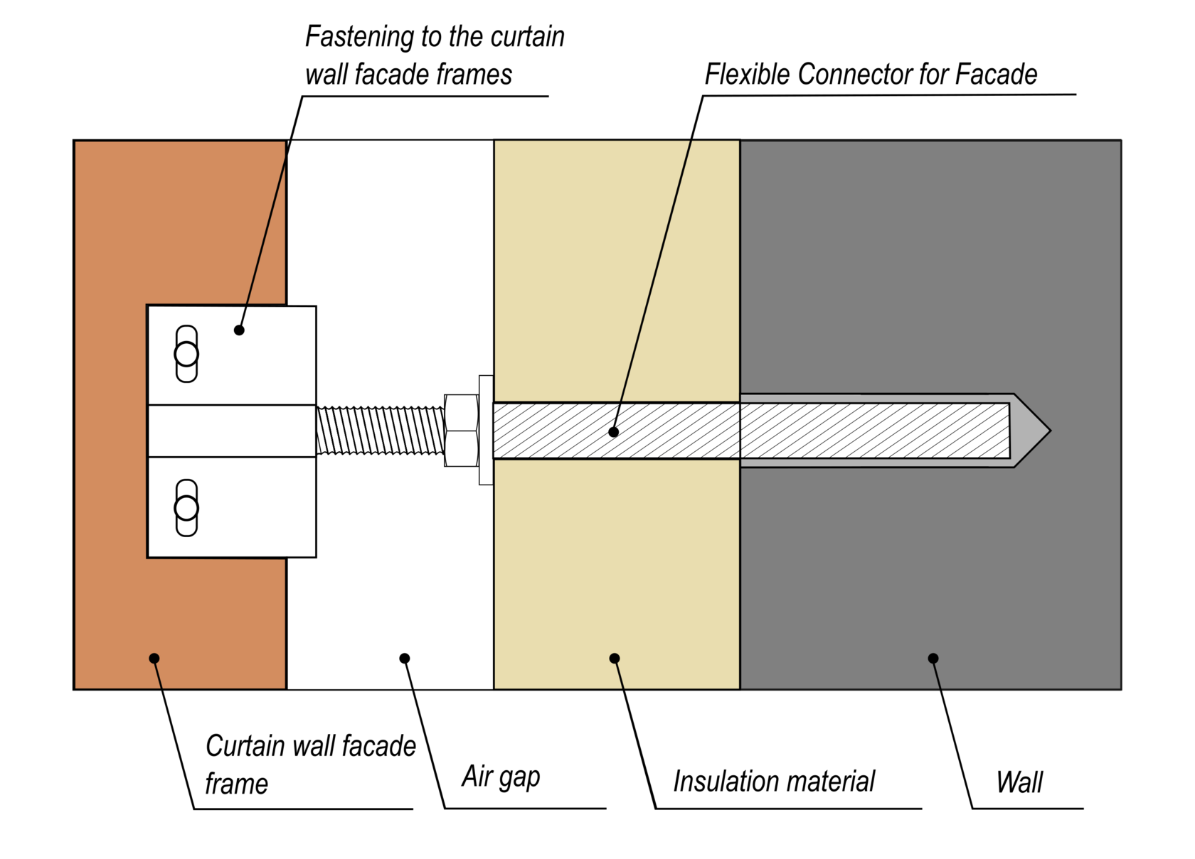 Fasteners for concrete or brick walls with or without thermal insulation layer that do not create thermal bridges. Flexible Facade Connectors consist of a fiberglass rod with a stainless steel threaded end