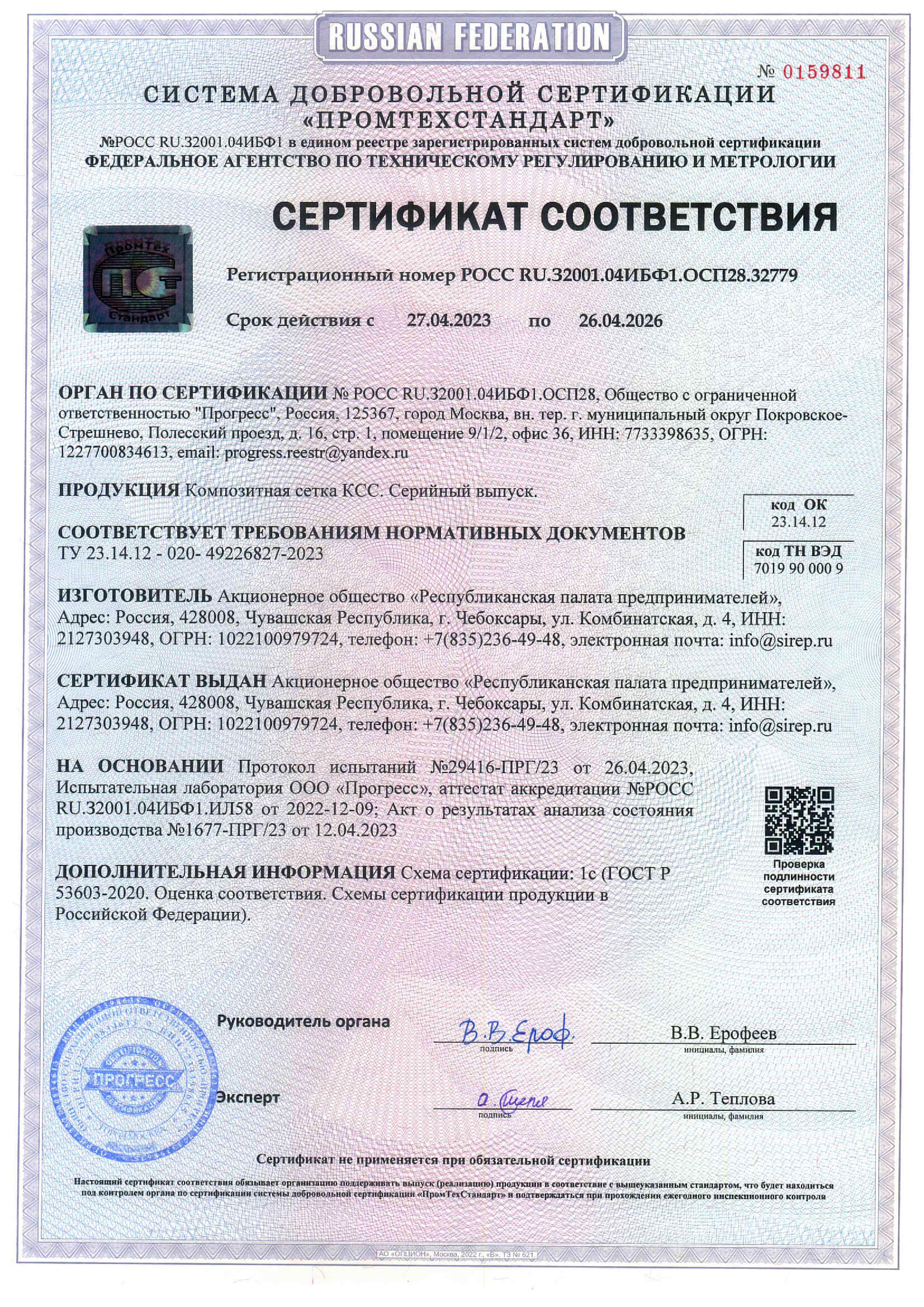 Certificate of Conformity for Composite Fiberglass Mesh